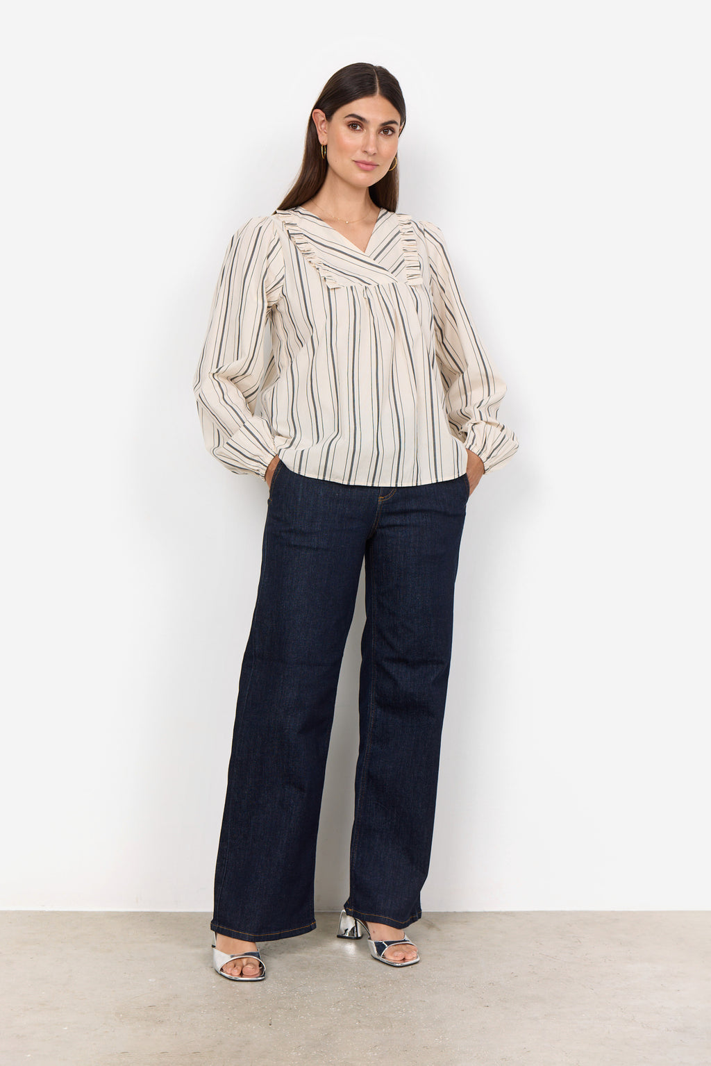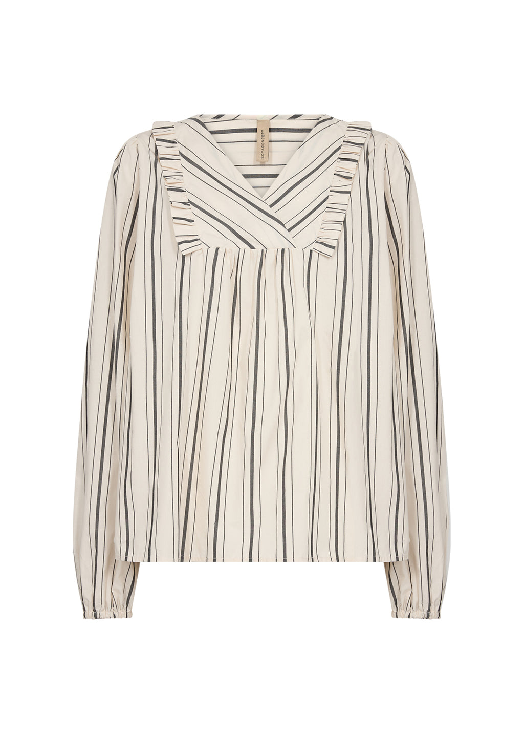 - V neck complemented by ruffled yoke.