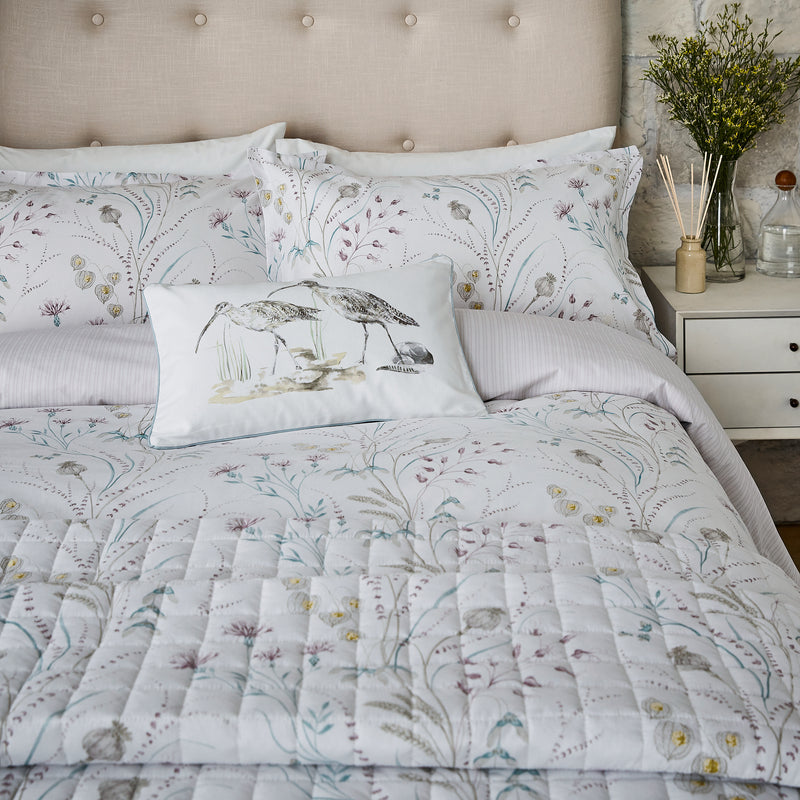 This wonderful duvet cover set features delicately drawn summer flora and fauna set on a crisp white backgound. The bright and uplifting main design is backed by a subtle, striped reverse that works perfectly when folded down, and also offers a nice alternative option.
