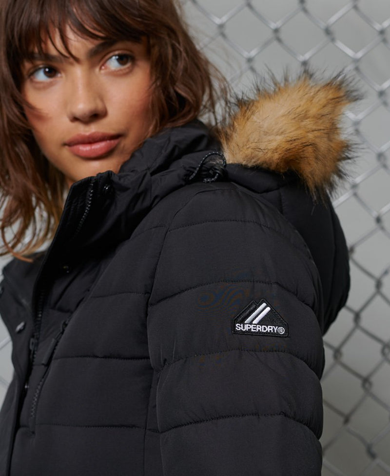 - Detachable hood with faux fur trim.
