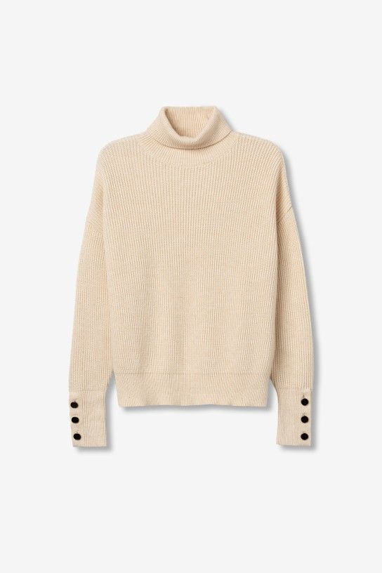 Relaxed fit long sleeve sweater with high neck. Medium-weight textured knit. Four decorative buttons on cuffs. Ribbed trim.