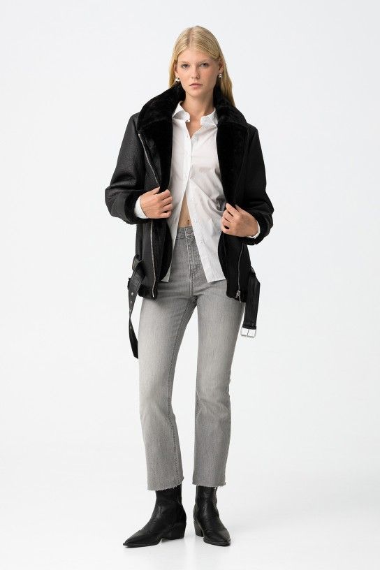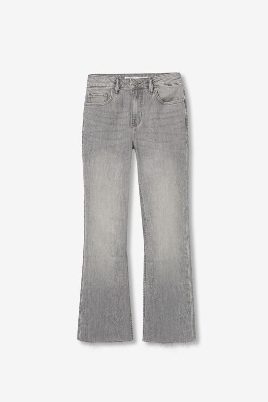 Megan Cropped Flare jeans, high-waisted with five pockets. Front fastening with zip and metal button. Frayed hem.