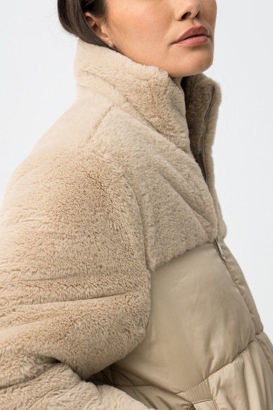 Relaxed fit padded nylon jacket, combined with synthetic fur, two front pockets and zipper closure. High collar, long sleeves, and elastic trims.