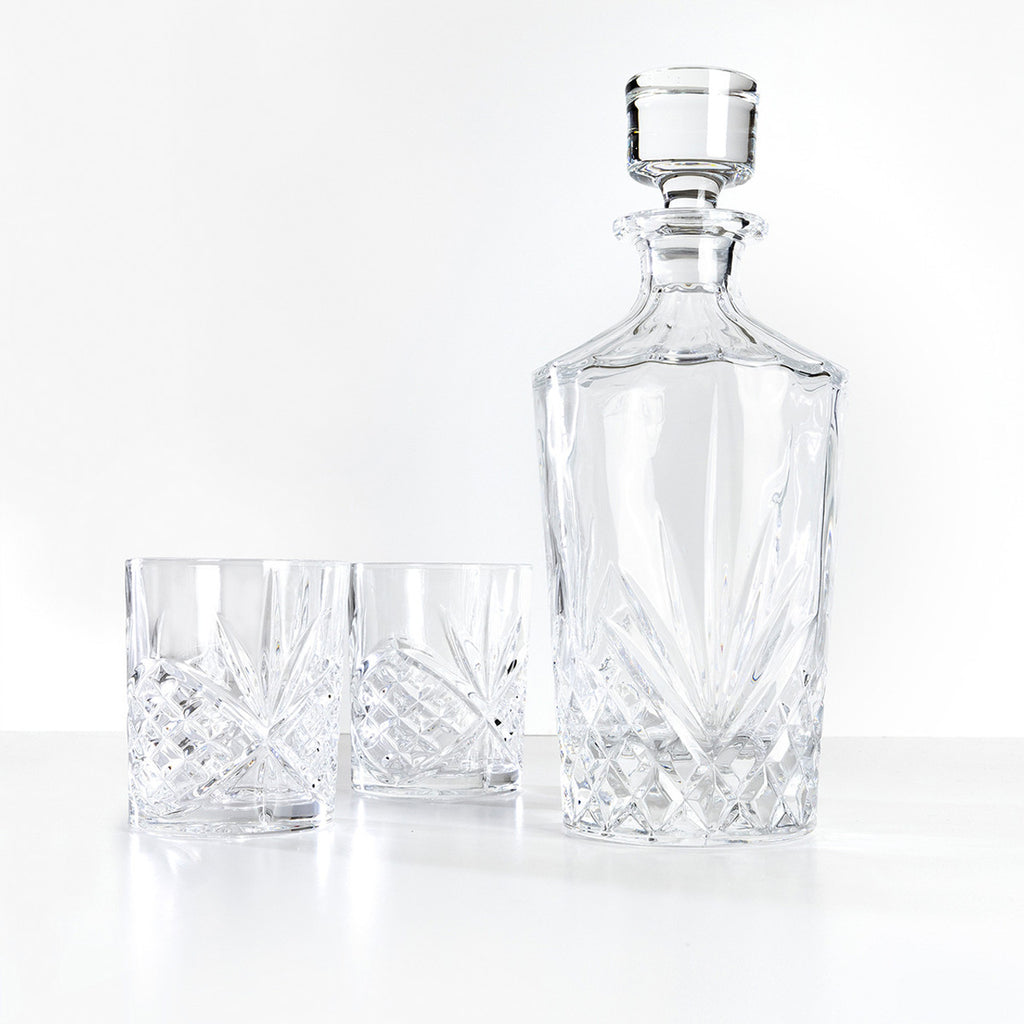This stunning Killarney Crystal trinity round decanter gift set contains a decanter & stopper and two old-fashioned tumblers. Add a touch of class to your next party with this elegant whiskey decanter set. With superior craftsmanship and attention to detail, this set would also make a wonderful gift idea for that special person.