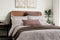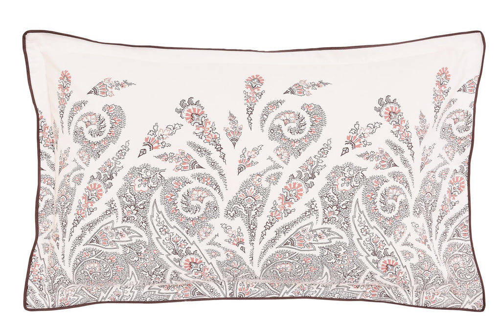 Umma features an intricate, ornamental paisley design in a serene palette of muted pink and soft grey, set against a delicate ivory base. The reverse side offers a subtle contrast with a small-scale geometric pattern, adding a modern touch.