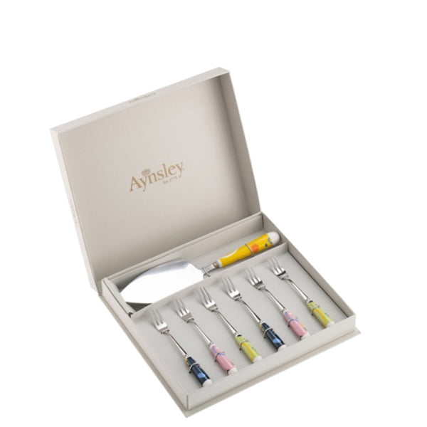 Bold colourways and mark making inform the design of Aynsley Verdant Teaware. Bright, contemporary, colourful and expressive teaware that will bring joy through use and display. Aynsley Verdant tableware is made from fine china.  This set includes a Cakeslice and 6 Pastry Forks.