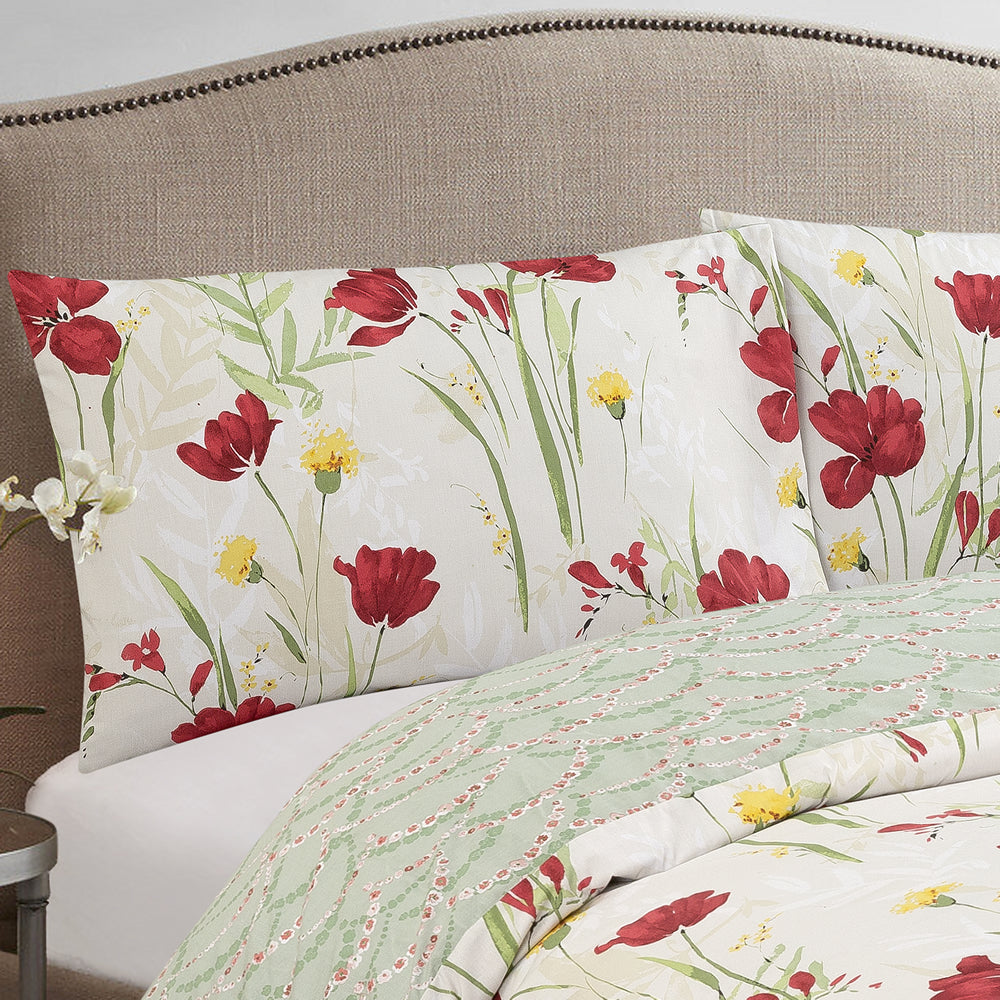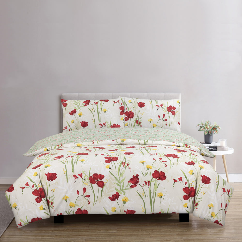 A floral poppy design on a neutral background with accompanying green foliage and yellow flowers.