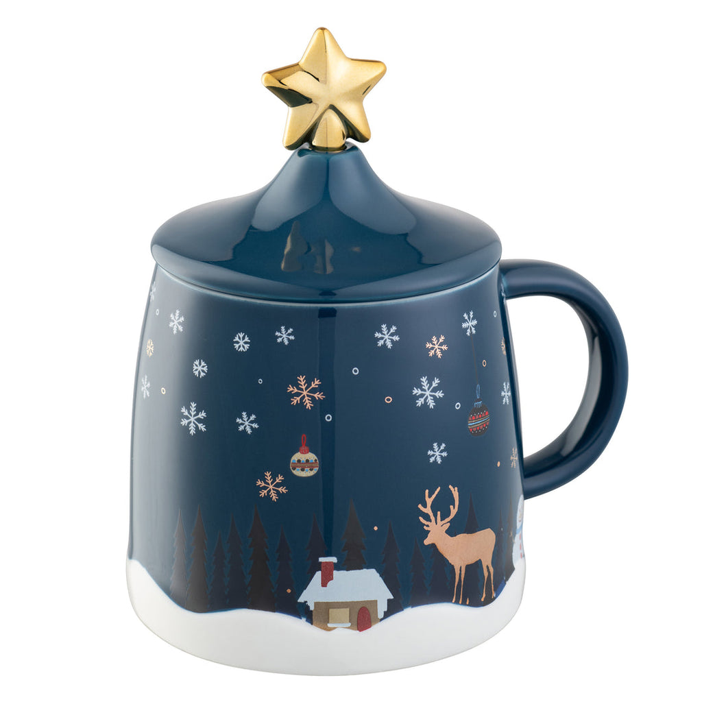 This cute 3-piece set includes a mug, a lid and a stirrer, when fully assembled it creates a cute winter scene with a star detail and gold accents. The lid is ideal for keeping hot drinks warm and the stirrer is the perfect edition to enjoy hot chocolates. Beautifully boxed, this mug is an ideal gift or stocking stuffer.