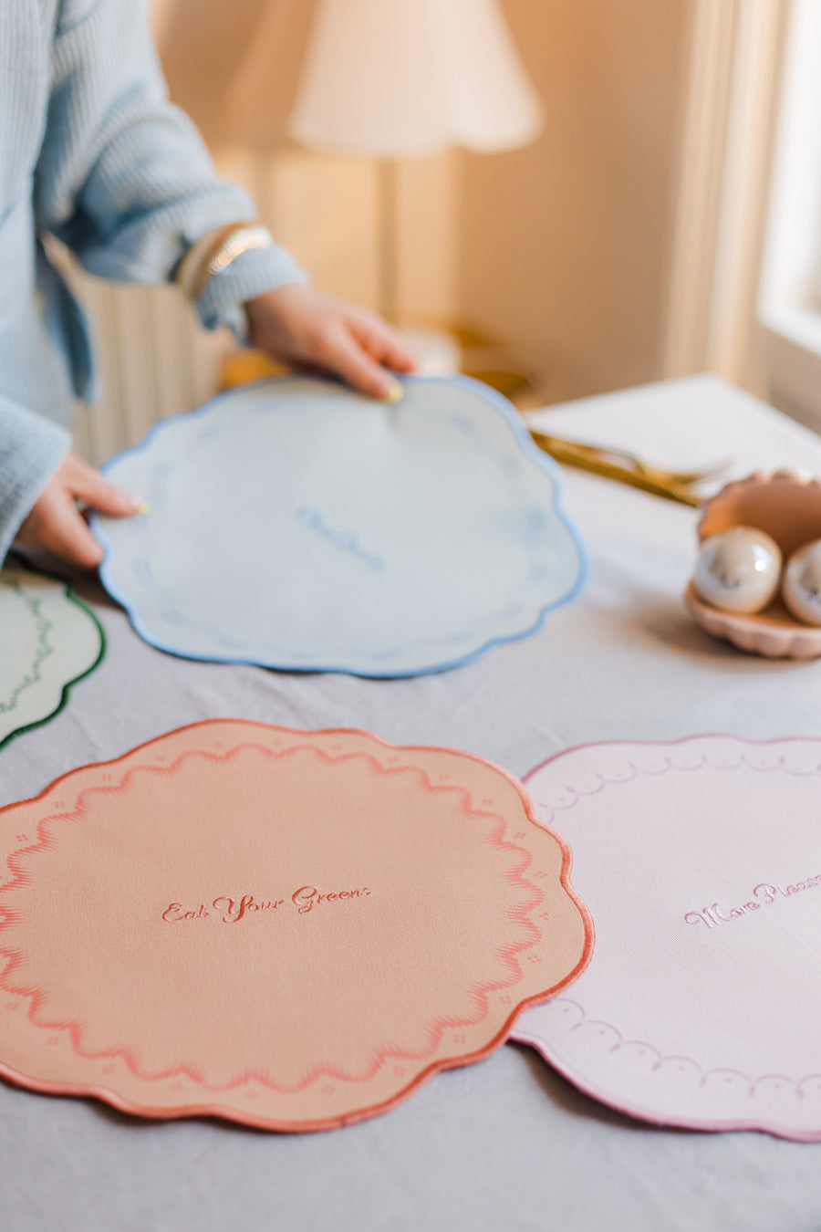 Say hello t gorgeous pastel embroidered placemats, bringing some quirky charm to the table. Pretty pastels and cheeky slogans, an iconic Yvonne Ellen combo!